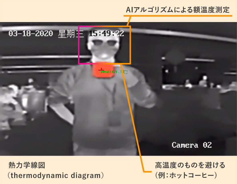 測定範囲内のすべての物体の温度を測定する。それに、AIアルゴリズム技術によって顔を検出し、額の温度データを抽出し熱力学線図を作ります。サーマルモジュールは、温度測定の正確性を確保するために、額の温度を顔にマッチします。