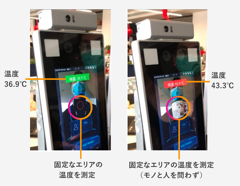 固定な小さいエリアに最大温度を測定する。顔認証後固定なエリアの最大温度値をディスプレイに表示する。 サーモパイル 技術は顔検出ができないため、測定できた温度は顔の温度かどうかが保証できず、認証された人物であるかどうかも保証できない。